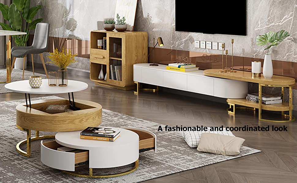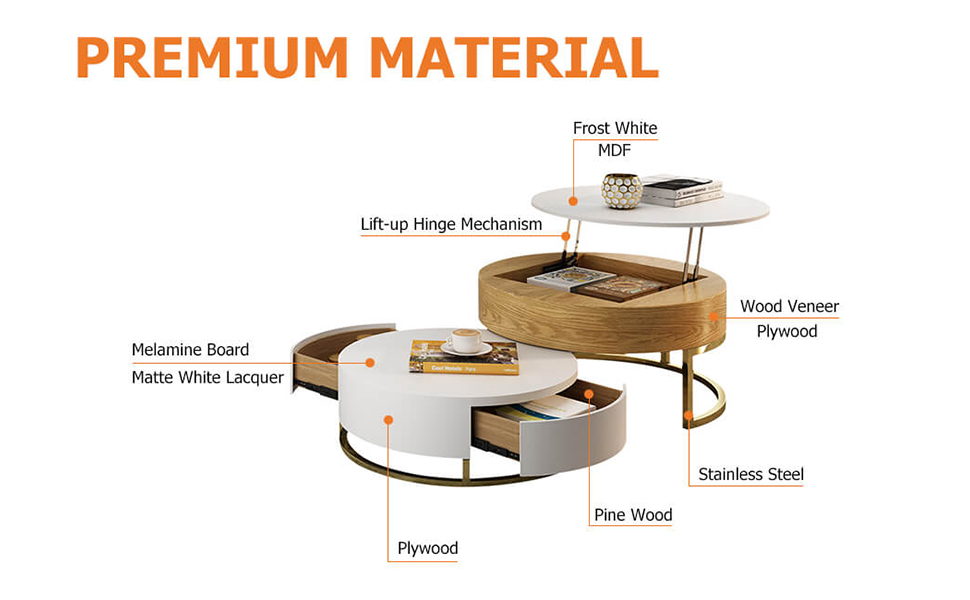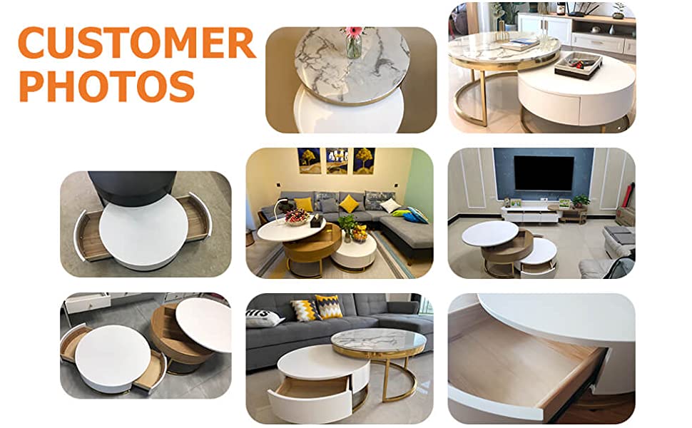• 【Furniture】Round Coffee Table White with Storage Lift-Top Wood Coffee Table Lifts up with Rotatable Drawers